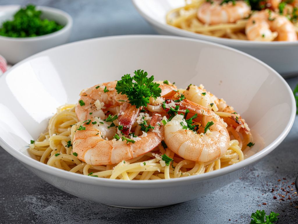 Smażone krewetki z cukinią, pomidorkami, szalotką, czosnkiem i chili.